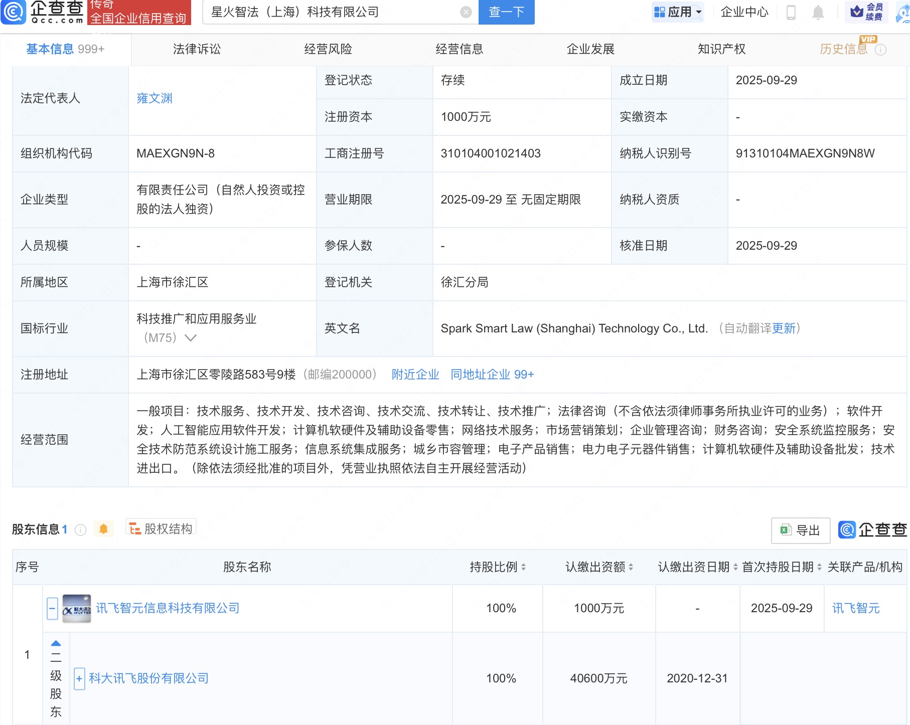 近日,星火智法(上海)科技有限公司成立,法定代表人为雍文渊,注册资本1000万人民币,经营范围包括人工智能应用软件开发、计算机软硬件及辅助设备零售、电力电子元器件销售等。企查查股权穿透显示,该公司由科大讯飞(002230)旗下讯飞智元信息科技有限公司全资持股。